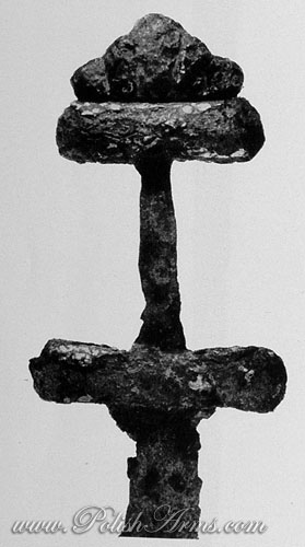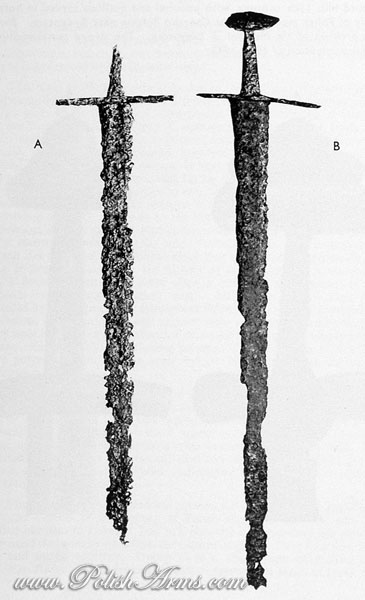 The technological examinations to which a large number of early medieval weapons found in Poland have been submitted, have enabled us to establish with fair certainty that the great majority of Polish arms were of local make. Though seemingly natural, this fact should be emphasized, since even to-day there still subsists the view—advanced once by German scientists—that the Poles, and indeed the Slavs in general, were unskilled in metallurgy and completely dependent for supplies of metal objects on imports from the Frankish state, from Germany, and from Scandinavia. The truth is that only some kinds of weapons were imported from the West and North to early medieval Poland. The imports included mainly swords, which for the most part were made and mounted in the famous centres of iron-working in the Rhineland, but spearheads and battle-axes were only exceptionally introduced from abroad. In addition to imported swords, others made in Poland or at least mounted there, were also used. [5]. All early medieval swords found within the Polish boundaries conform to the types characteristic of North, West, and Central Europe classified by J. Petersen.[6]. Thus we encounter swords of his types B, D, H, J, K, M, R, S, T, Y, Z. They include specimens with nuts richly encrusted with non-ferrous metals (Picture 2). A fine sword of Type T, with quillons and pommel carved in horn, found at Czersko Polskie near Bydgoszcz, was probably mounted in Poland (Picture 3). Most numerous, however, are swords of type X and the so-called “Early Romanesque” ones (in Polish literature on this subject they are also known as type “a”).[7]. The majority of swords, which may be regarded as Polish products, are attributable to the two last types (Picture 1). It should be mentioned here that in the literature on this subject there is a tendency to attribute the origin of the Early Romanesque sword to too late a date.[8]. Swords of this type should be rather dated to the 11th century. This is suggested by the fact that a sword of this type appears in a well-known miniature from the Bible of Otto III, dating from about 1000. [9]