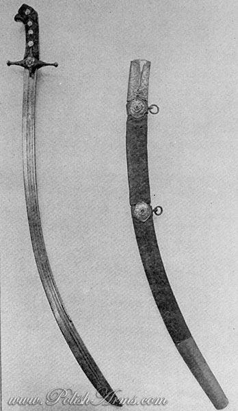 By the close of the Middle Ages various types of sabres were introduced into Poland. It was not, however, until the second half of the 16th century that the sabre began to enjoy popularity and finally replaced the sword to become a characteristic national weapon. The first sabre to be used in Poland (in the reign of Stephen Bathory) was of the Turkish type, introduced to us via Hungary (Picture 1). Its blade was stiff, slightly curved, 80-90 cm long, rather broad, and double-edged toward the point. The hilt was of wood covered with leather. The iron cross was very long, straight, and furnished with equally long langets. The rather flat metal pommel, was bent slightly forward. The sheath was of wood with metal mountings.