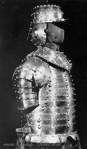 The Polish coat of mail (Picture 15) from the end of the 16th century and during the 17th century, was a garment with sleeves reaching down to the elbows or even to the hands. The fairly large iron rings were rivetted together. Sometimes the coat of mail was decorated with various rosettes, medallions, plates, and buckles, often made of brass and thus contrasting with the background of the iron mail. The shoulders of the mail coat were occasionally reinforced by means of disc-shaped plates.