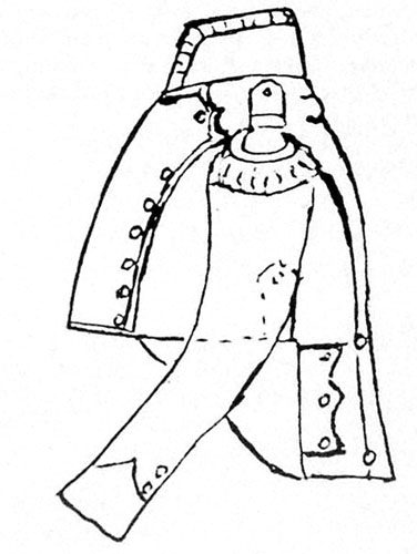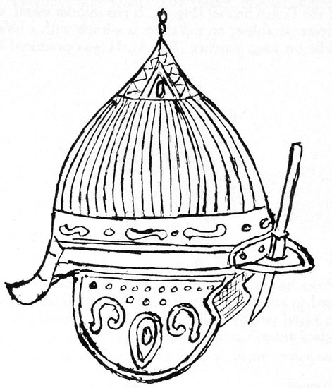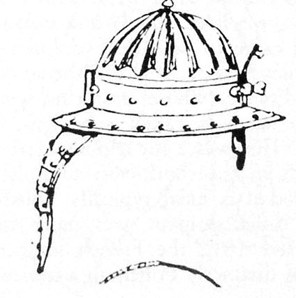 “The Polish so-called hussarian shishague was developed in two ways. In the first place, it evolved from a Turkish helmet by the addition of a peak, ear covers, and initially a few small neck protecting laminations. The first such helmets were made in Germany on orders from Polish nobility. The second route of development was from the so called «Kapalin », somewhat similar to the so-called war hat or a type of pikesman’s helmet. This has added lobster-tail, laminations on the back for neck protection, possibly the first used in Europe, the brim narrowing to complete disappearance, adding instead ear covers and peak with a nasal bar (Figs. 6 and 7). “